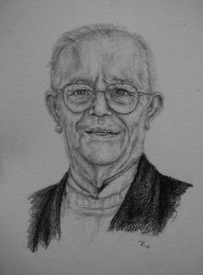 E a conversa voou, e para concluir, e como forma de agradecimento pela grande manifestação da sua presença na minha vida (relembro que foi ele que me baptizou, confessou pela primeira vez, me deu a primeira comunhão, a profissão de fé... e ainda... foi através dele e por ele, que eu conjuntamente com a Pipa, consegui ir fazer voluntariado ao centro João Paulo II em Fátima no passado mês de Junho de 2008), entreguei um retrato dele feito por mim, que pode ser visto em baixo.